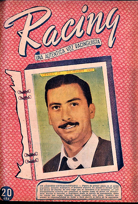 Portada de la revista Racing anunciando la llegada de Antonio Oscar Rodríguez como arquero al club en diciembre de 1947.