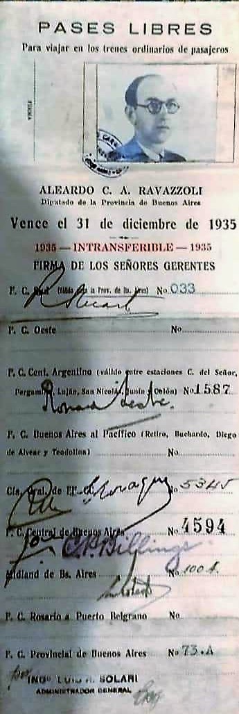 Pase libre de ómnibus del entonces Diputado de la Provincia de Buenos Aires por la Primera Sección Electoral, Aleardo Ravazzoli.