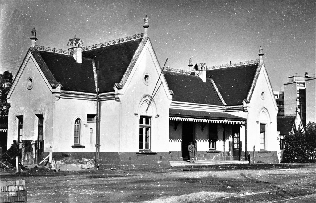 Frente norte de la Estación Mitre, perteneciente al Ferrocarril Bartolomé Mitre en el Ramal Mitre-Retiro. En sus inmediaciones se puede apreciar lo que hoy en día es la Plaza de los Inmigrantes, localizada entre las calles Fernán Félix de Amador y la Avenida Maipú.
