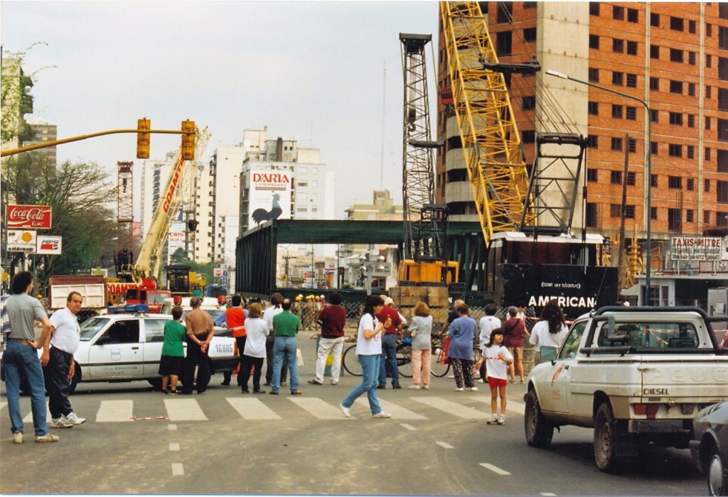 Vista del puente peatonal del Tren de la Costa durante su construcción. Este puente se decidió construir en 1993 para conectar las terminales Maipú del Tren de la Costa y la Estación Bartolomé Mitre del Ferrocarril Mitre, Ramal Mitre-Retiro.