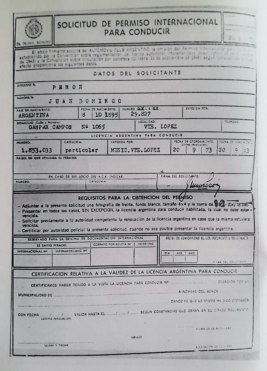 Solicitud de permiso internacional para conducir emitida en Vicente López a nombre de Juan Domingo Perón.
