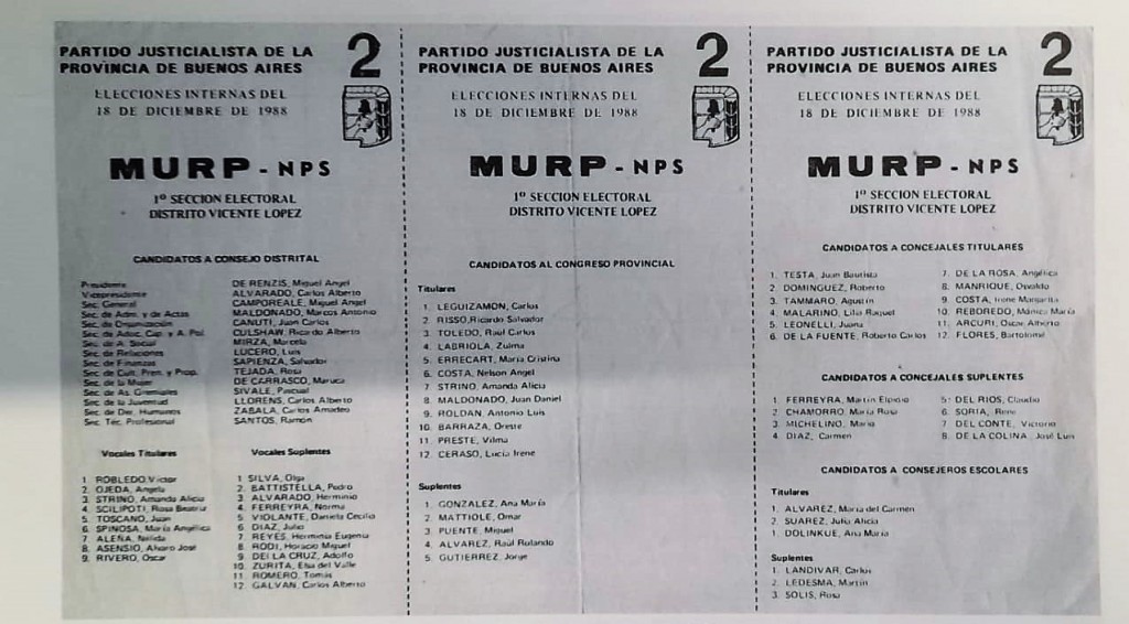 Boleta de las elecciones internas del Partido Justicialista en Vicente López, año 1988.