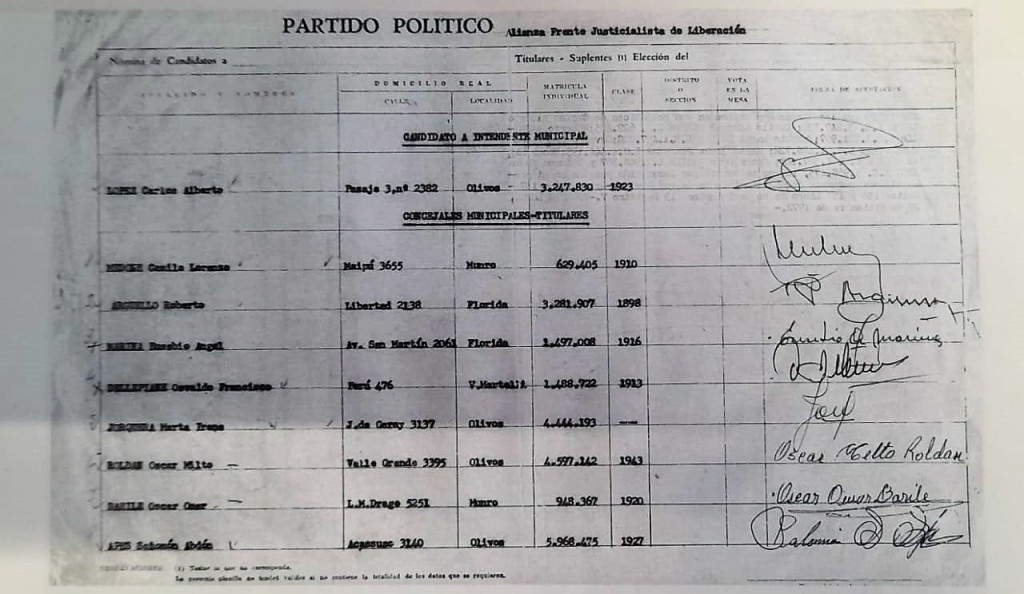 Listado de candidatos de la Alianza Frente Justicialista de Liberación a intendente y concejales en Vicente López, para las elecciones nacionales de 1973.