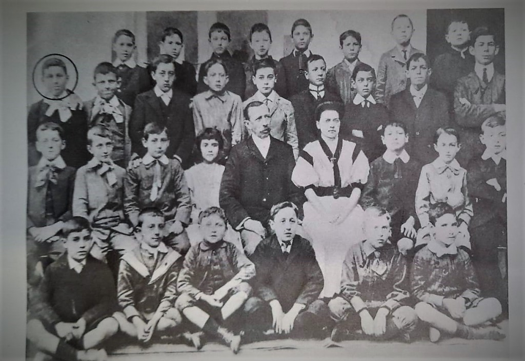 Alumnos del Colegio Internacional de Olivos hacia 1905. En el extremo izquierdo, señalado en un círculo, se encuentra Juan Domingo Perón, quien asistió a este prestigioso establecimiento educativo antes de ingresar al Colegio Militar.