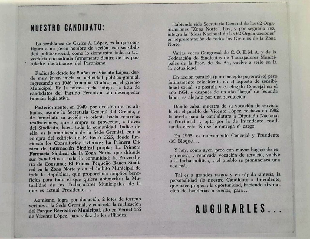 Dorso del volante utilizado como propaganda para la candidatura de Carlos Alberto López a intendente de Vicente López por el Frente Justicialista por la Liberación en las elecciones de 1973. Estas elecciones marcaron el regreso del peronismo al poder tras 18 años de proscripción, y López fue electo. Sin embargo, su mandato se vería interrumpido por el golpe cívico-militar de 1976.