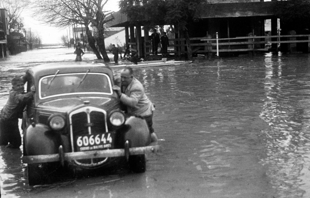 Vecinos del bajo de Vicente López empujando un automóvil varado debido a la inundación causada por la crecida del Río de la Plata.