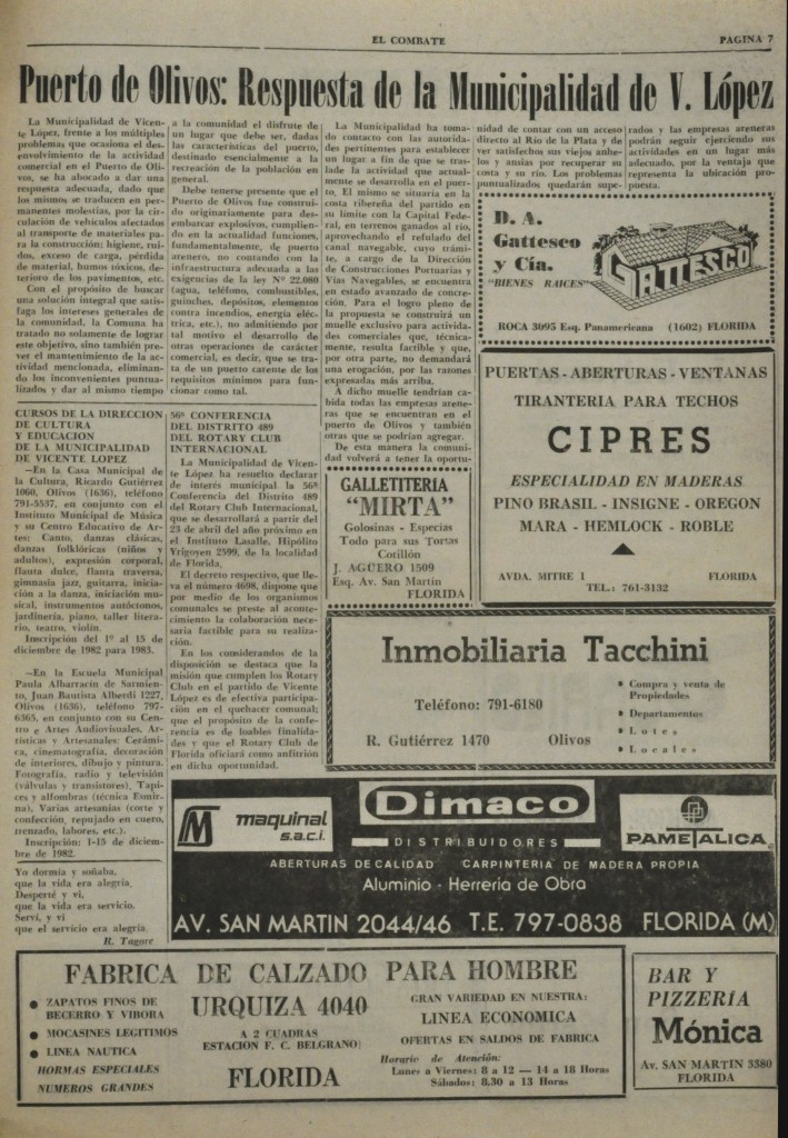 Nota publicada en el periódico zonal El Combate en 1982, en la que se aborda la regulación del funcionamiento de los comercios en la zona del Puerto de Olivos.