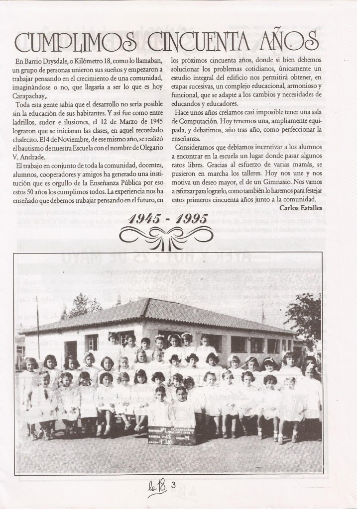 Nota publicada por el 50° aniversario de la Escuela Primaria N° 18 Víctor Andrade, ubicada en Drysdale 5615, Carapachay.
