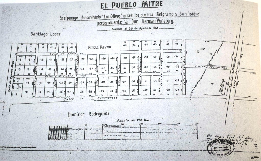 Planos catastrales de Pueblo Mitre, ubicado en el paraje Los Olivos, entre los pueblos de Belgrano y San Isidro. Esta fue una de las primeras denominaciones de las tierras que luego conformarían el centro del partido de Vicente López.