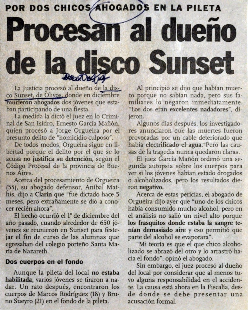 Nota publicada en el diario Clarín que hace referencia al procesamiento del boliche Sunset, anteriormente localizado en la zona del bajo de Olivos.