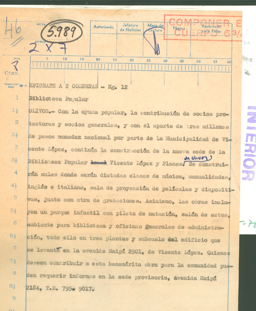 Facsímil de noticias del diario La Nación sobre la próxima publicación relacionada con la creación de la Biblioteca Popular de Olivos hacia 1970. La biblioteca, fundada el 9 de octubre de 1921, tiene como objetivo garantizar el acceso a la lectura y fomentar el hábito de la misma entre los vecinos del partido.