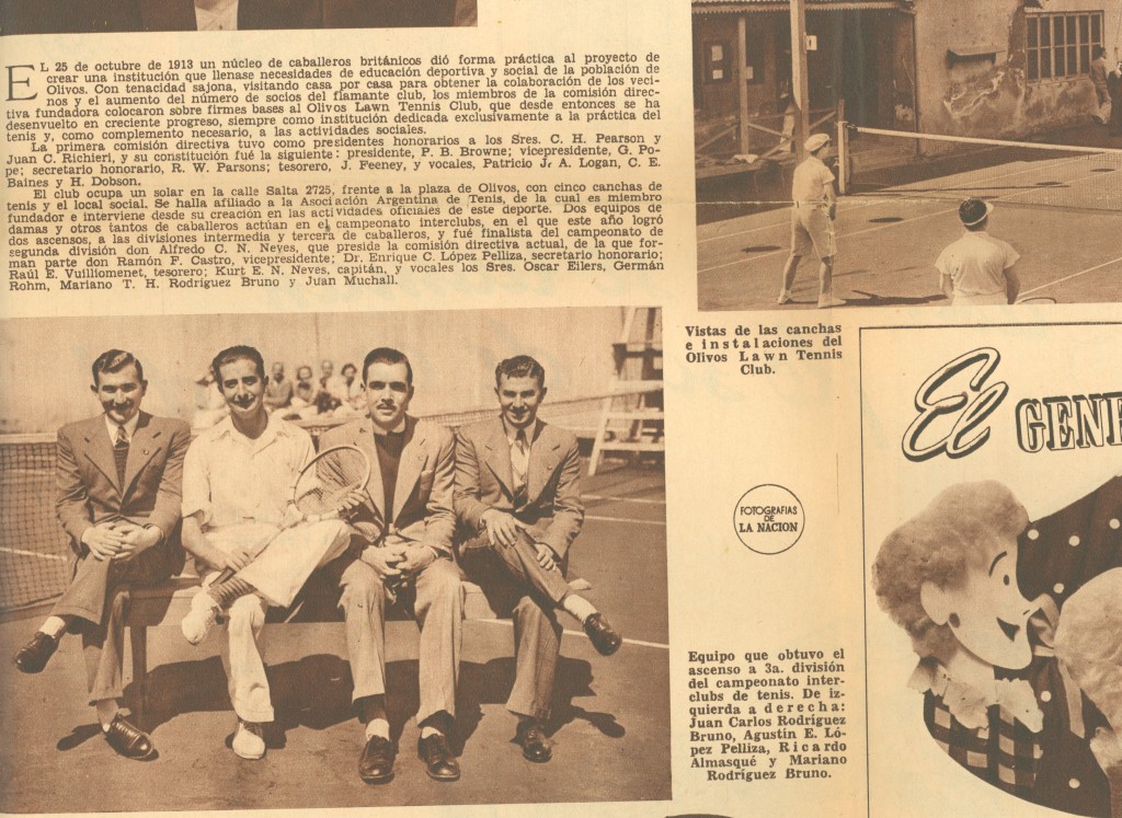 Nota publicada en el diario La Nación el 30 de octubre de 1938, con motivo del 25° aniversario (Bodas de Plata) del Olivos Tenis Club. Fundado el 25 de octubre de 1913 por inmigrantes ingleses empleados del Ferrocarril Central Argentino, el club se destacó desde sus primeros años por la inauguración de la primera cancha iluminada de Sudamérica, a fines de 1914, y la organización de torneos nocturnos que atraían a una gran cantidad de público, con una entrada de 5 centavos.