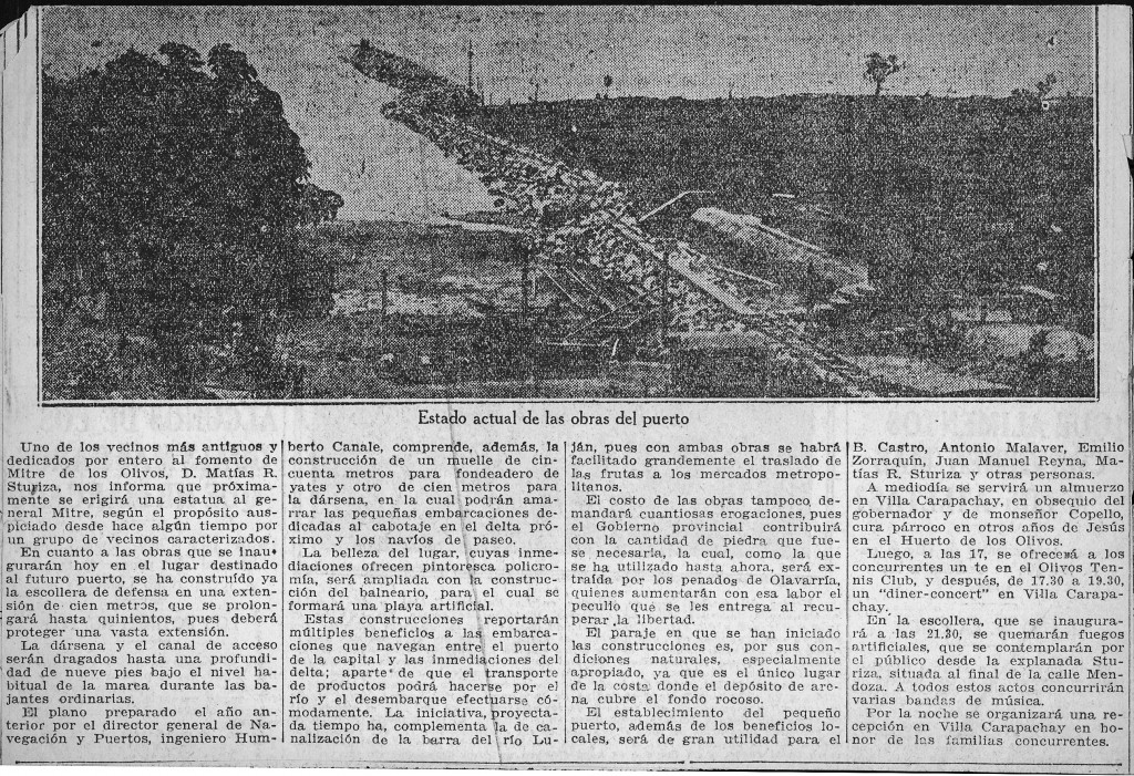 El artículo, publicado en el diario La Nación alrededor de 1930, detallaba los avances de las obras en el puerto de Mitre en Olivos, una iniciativa impulsada por Matías R. Sturiza, un vecino destacado en el desarrollo de la zona. A solicitud de Sturiza, se planeaba erigir una estatua en honor al General Mitre en el área del puerto.