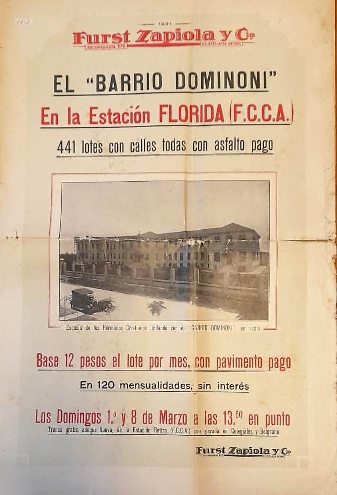 Folleto publicitario de 1931 que anuncia la venta de lotes en el denominado Barrio Dominoni, situado en proximidades del actual Colegio La Salle, en el barrio de Florida.
