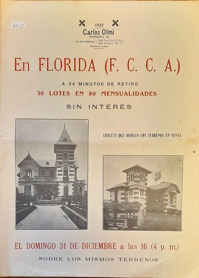 Folleto publicitario del año 1930 que anunciaba la venta de treinta lotes ubicados en las calles Ayacucho, España, Villate y Olaguer Feliú, en el barrio de Florida.