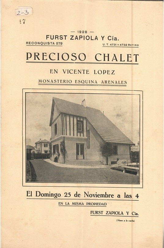 Anuncio del año 1928 que publicita la venta de un chalet ubicado en la esquina de las calles Monasterio y Arenales, en el barrio de Vicente López.